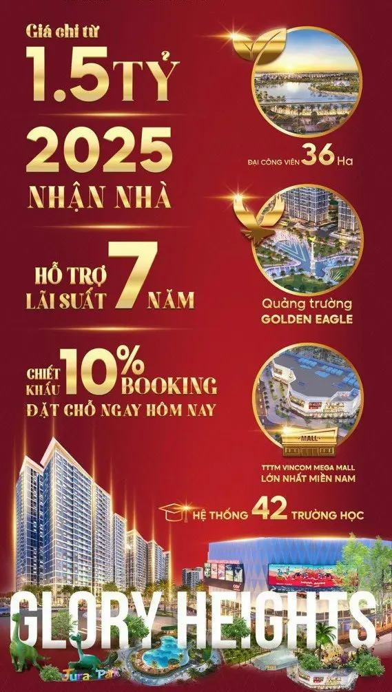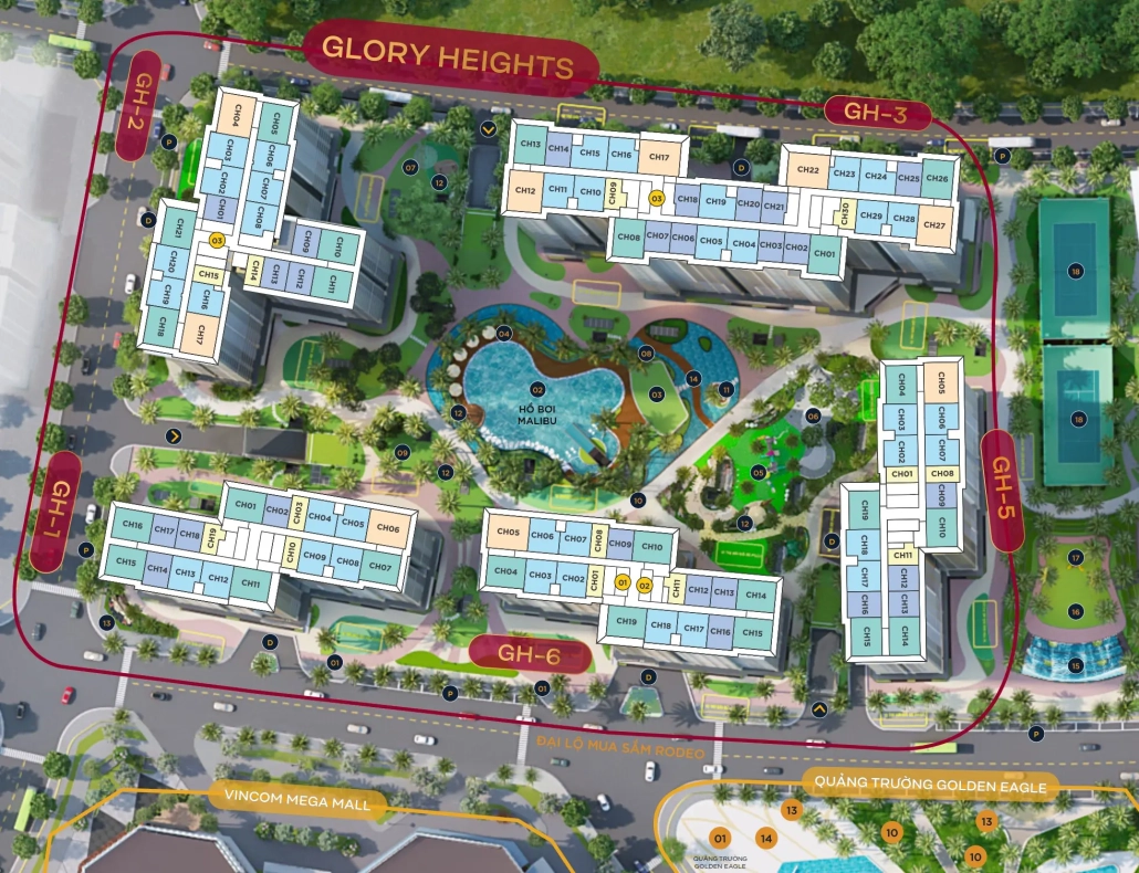 Glory Heights sở hữu vị trí đắc địa nằm trên trục Đại lộ mua sắm Rodeo, đối diện TTTM Vincom Mega Mall, Quảng trường Golden Eagle. Từ đây, cư dân dễ dàng di chuyển đến công viên 36ha, các trường học VinSchool, trường Brighton College, trạm Depot Vinbus…